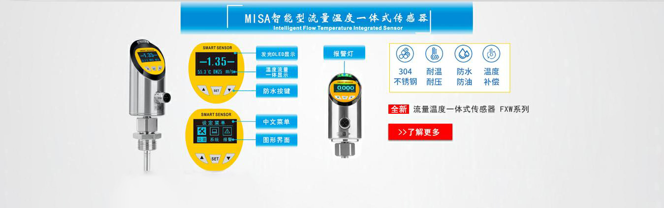 MS-FXG 流量溫度傳感器產品特點: 1、溫度和流量 一體式傳感器 2、自發光OLED;顯示清晰銳利 3、溫度智能顯示報警接點輸出 4、流量智能顯示報警接點輸出 5、中文+圖形界面;傻瓜式菜單 6、數字通信;模擬量一體式 7、精度高穩定性好 8、耐結垢,耐腐蝕 8、全灌封設計全防水殼體 9、耐壓高、高壓型可耐壓10MPa 10、手機掃碼安裝指導功能;無需說明書在線工程師專業服務